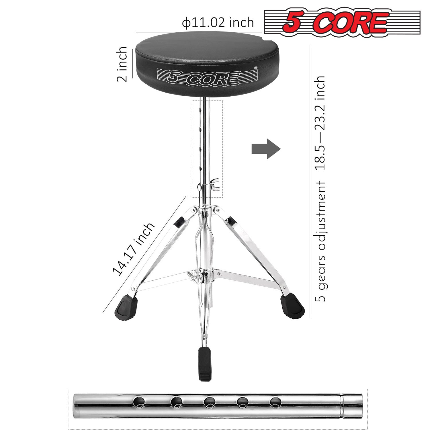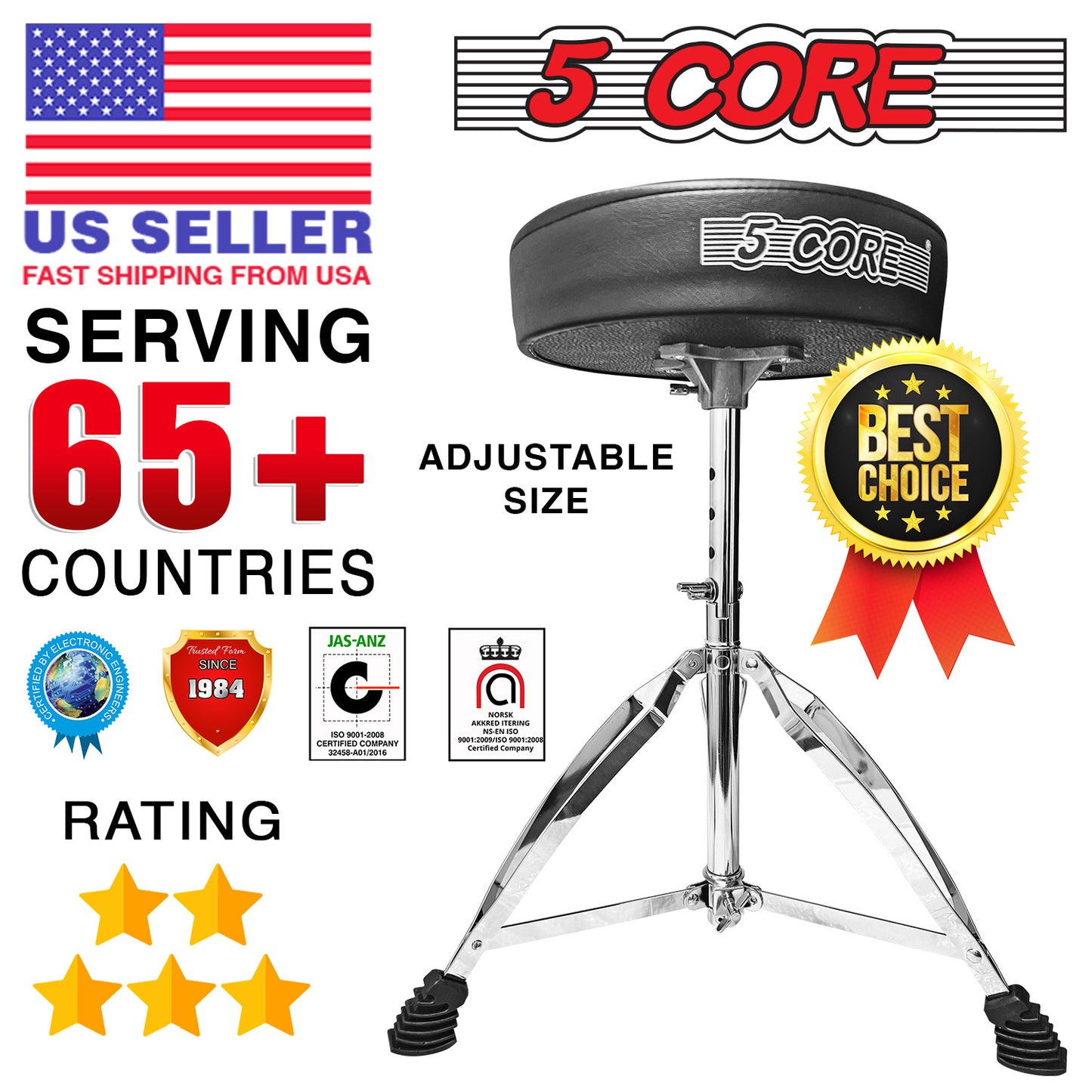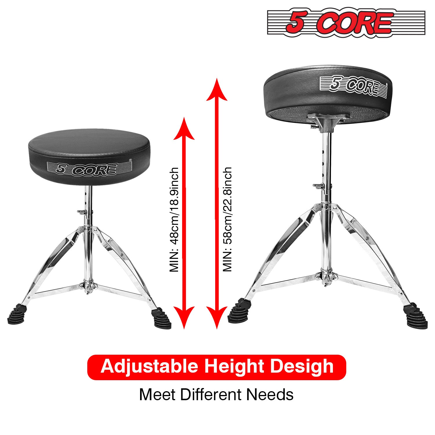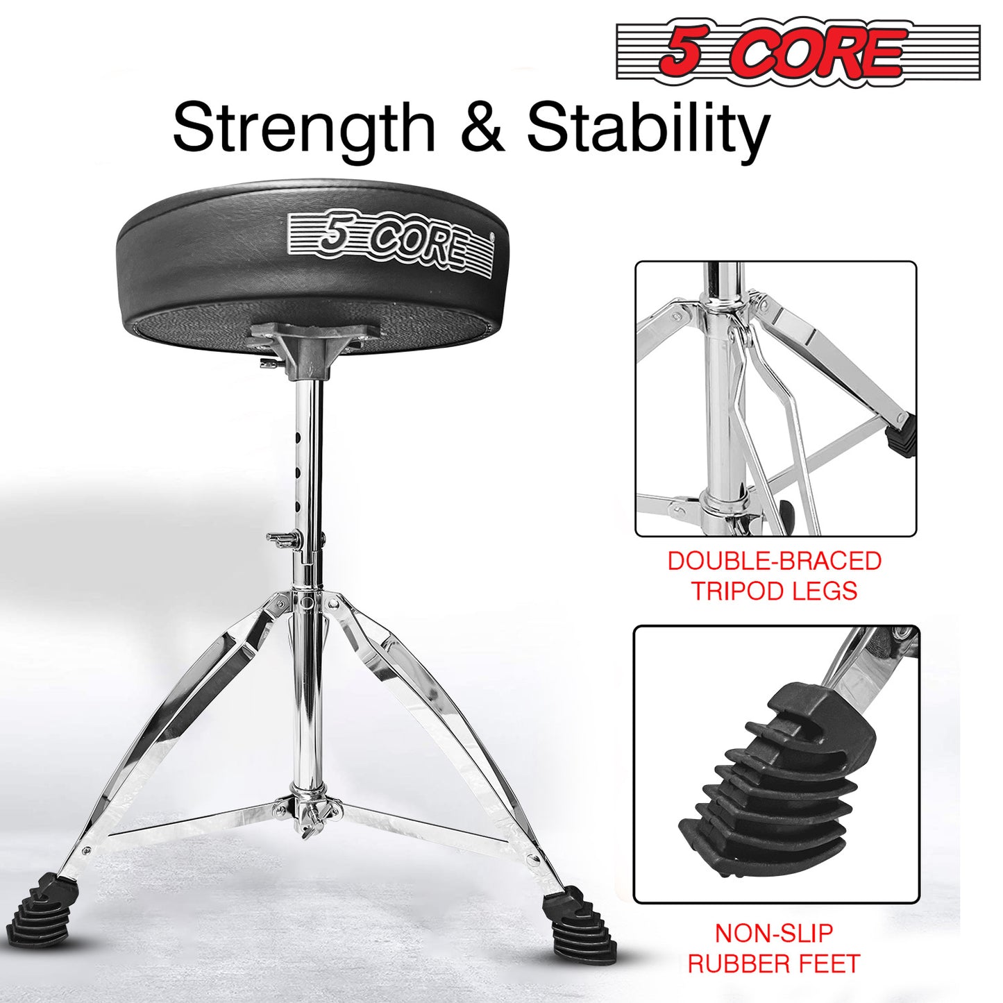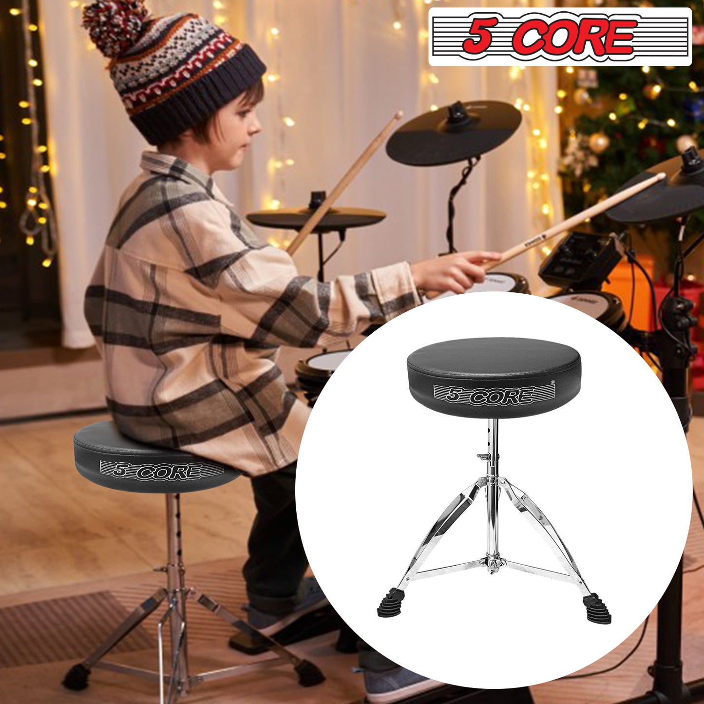 Question: Can Drum throne be adjusted for height? Answer: Yes, 5 Core drum stools are adjustable to accommodate drummers of different heights and playing styles. |