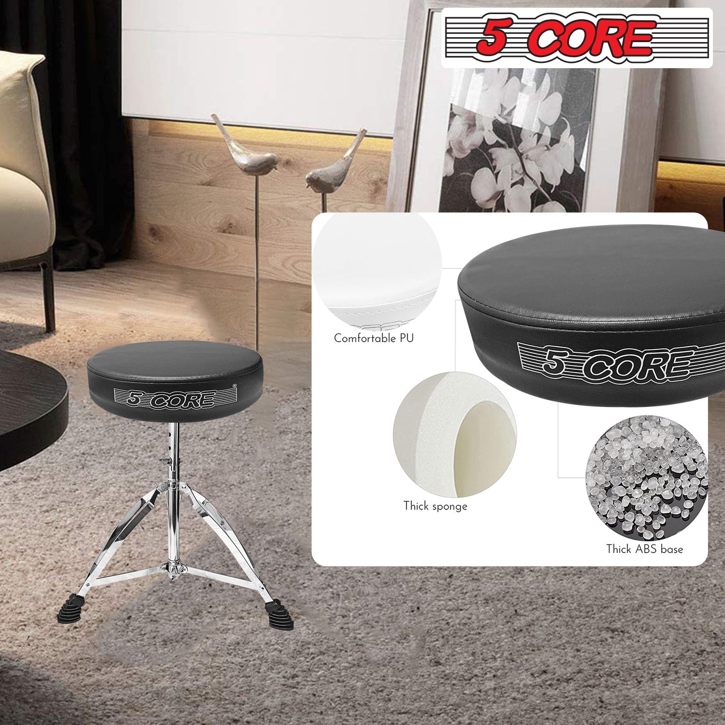 5 Core Black Drum Throne Black: Sit Comfortably, Play Masterfully!High-Quality Materials:The 5 Core black drum throne features high-quality materials, including a high-density sponge and wide drum seat surface. These materials are durable and reliable, even after long-term use, and will not deform.