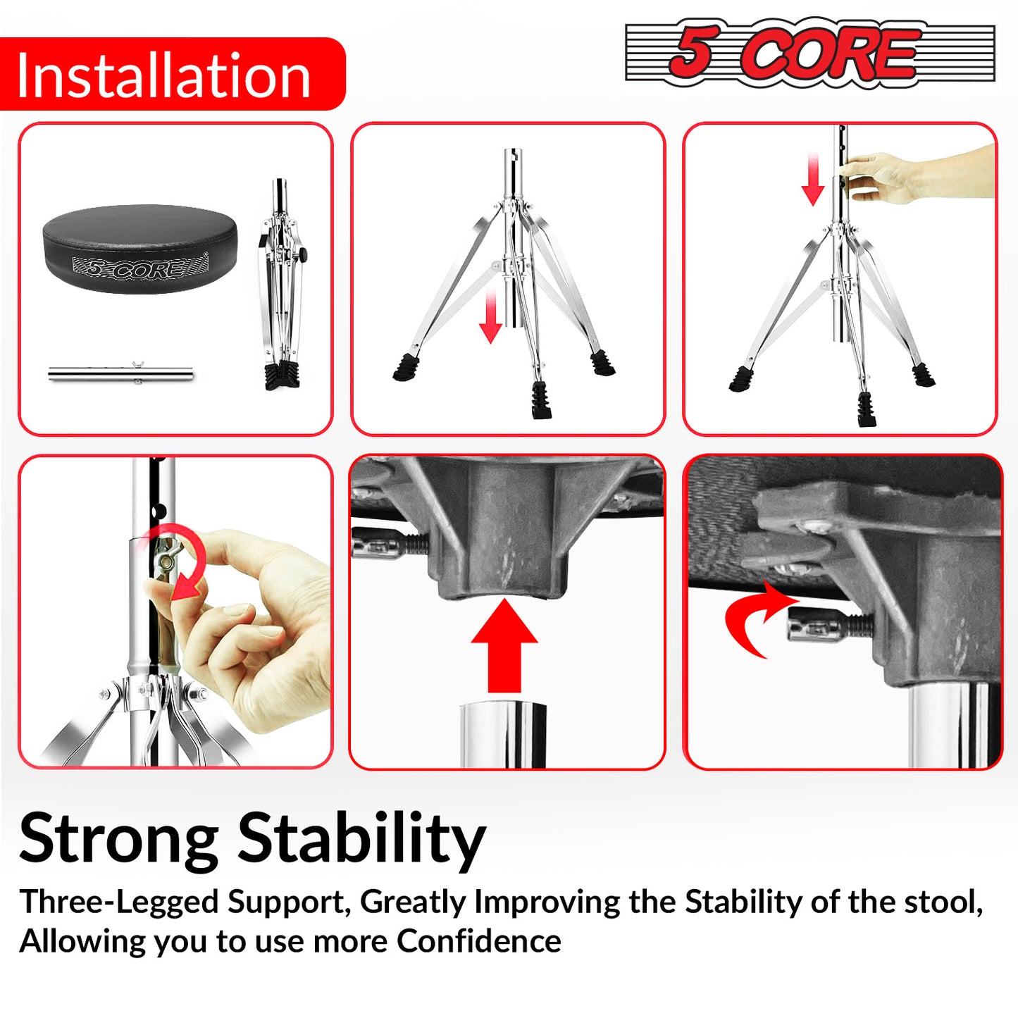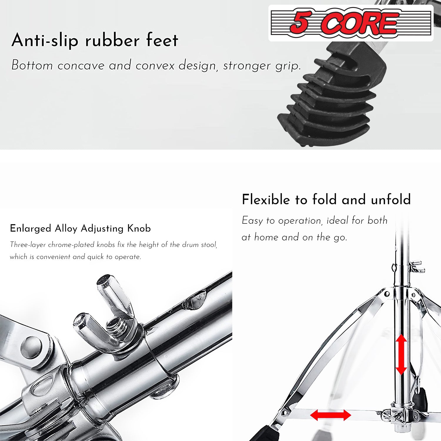 Double Support Legs:The 5 Core guitar/ Black Drum throne features double support legs with sturdy metal rods and high-quality connectors, making the bracket more stable and durable. Additionally, the drum throne comes with super anti-slip rubber pads that provide excellent stability and protect your floor.