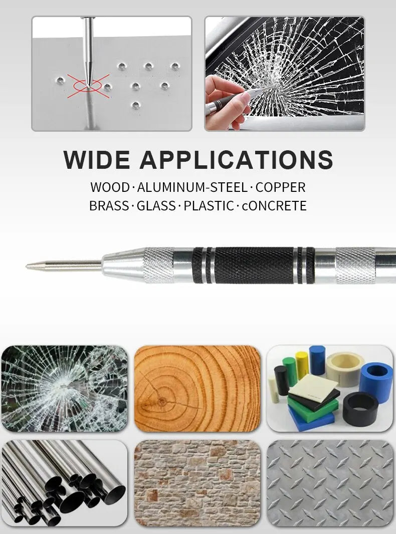 Use: Wood drilling, steel punching, glass striking, emergency window breaking