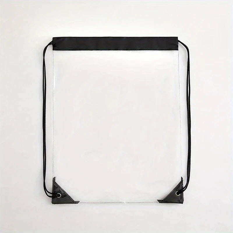 Backpack type: softback drawstring. Closure: string cinch. Capacity: below 20 L. Dimensions: 33.5 × 43 cm (approx. 13.2" × 16.9"). Main material: PVC (transparent), lining: PVC. Carry system: arcuate shoulder strap with soft handles. Gender: unisex (men, women, kids). Style: casual, modern, lightweight. Rain cover: no (easy wipe-dry). Exterior/decoration: none (clean look). Origin: Mainland China (Zhejiang). Technics: jacquard details. Use cases: school gym bag, fruit-storage tote, beach bag, outdoor fitness/sport pack, yoga, cycling, hiking, day trips, travel, business trips, room-organizing storage. Package includes: 1 drawstring backpack. Care: wipe clean by hand; do not bleach or iron. Notes: minor color/size variance may occur (1–2 cm).