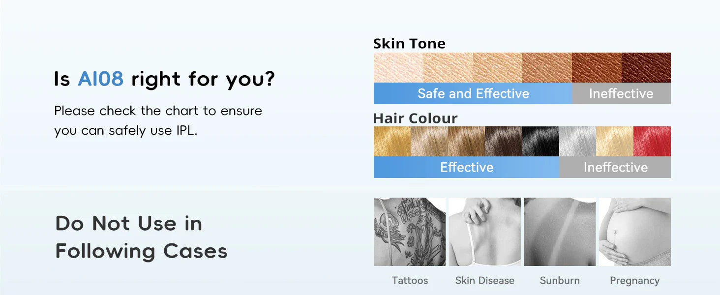 ● IPL epilator is suitable for white to light brown skin and black to light brown body hair. However, this product should not be used on: Tanned, tattooed and dark-spotted skin, white, gray or red body hair (see skin tone chart)