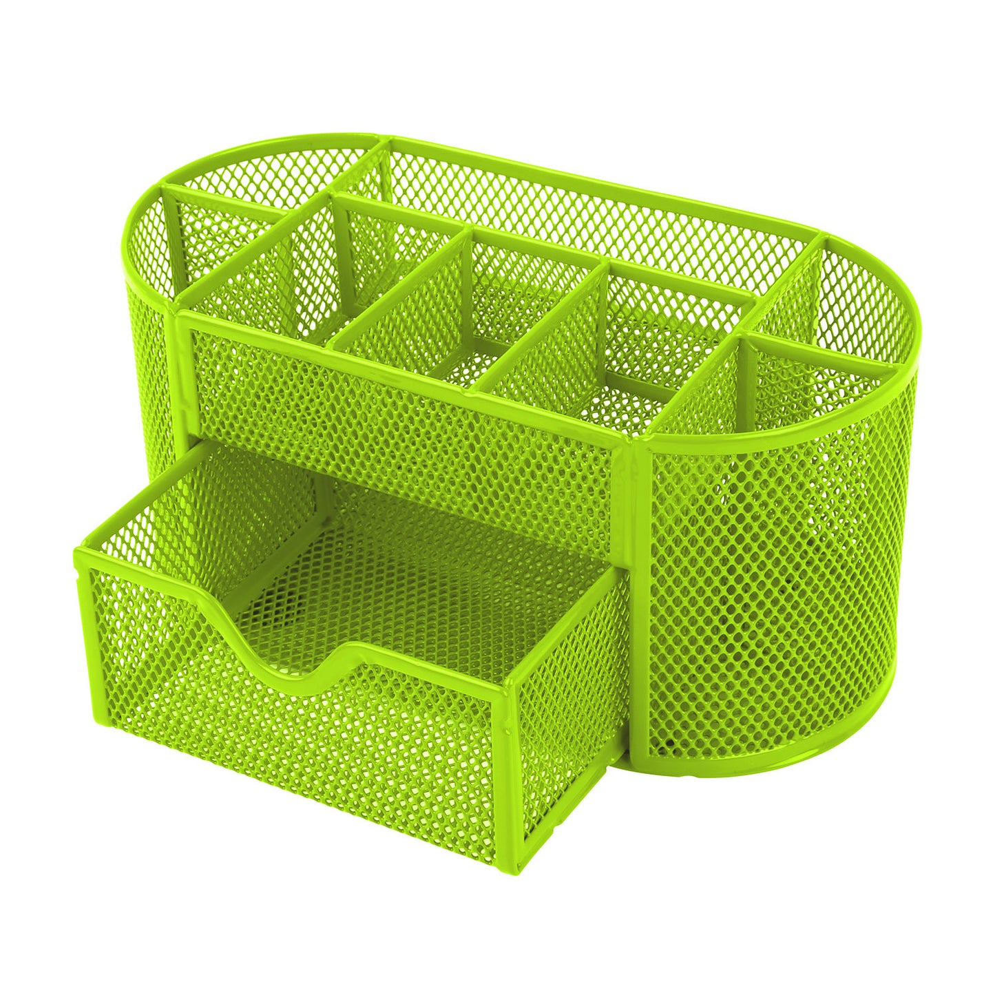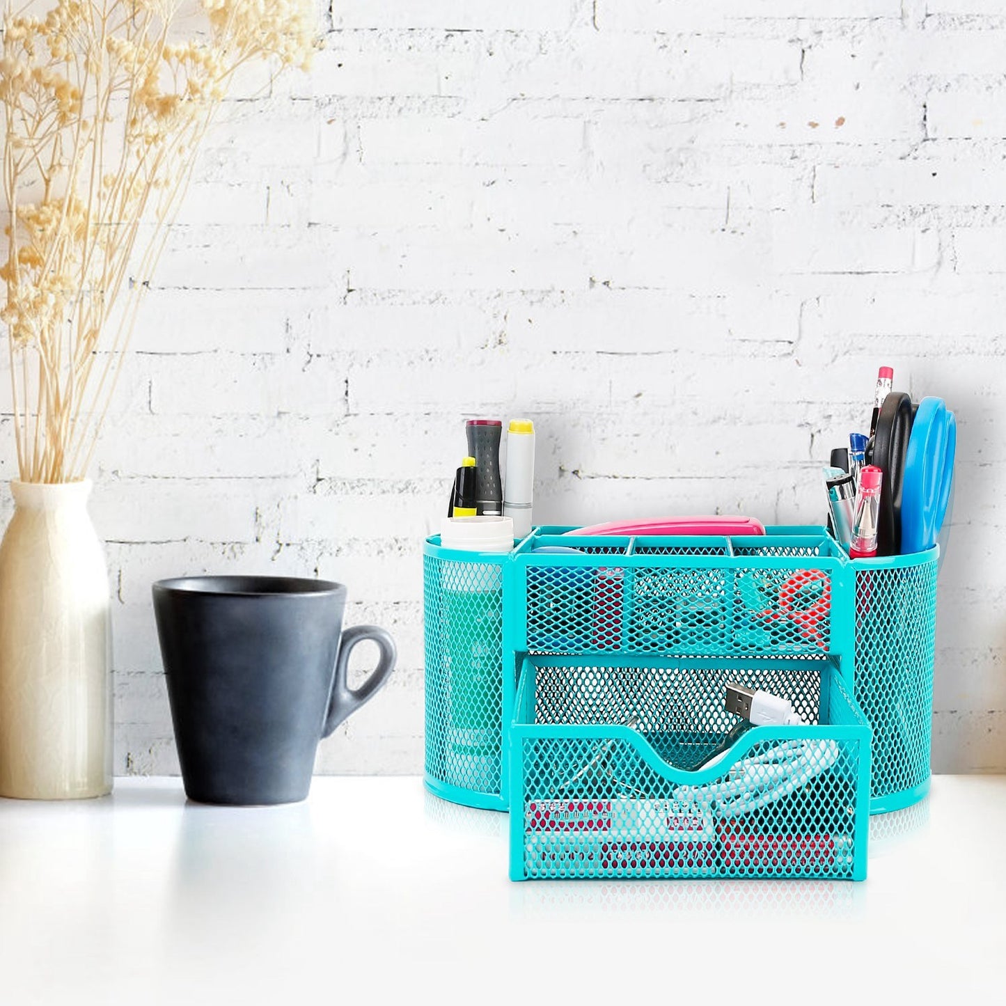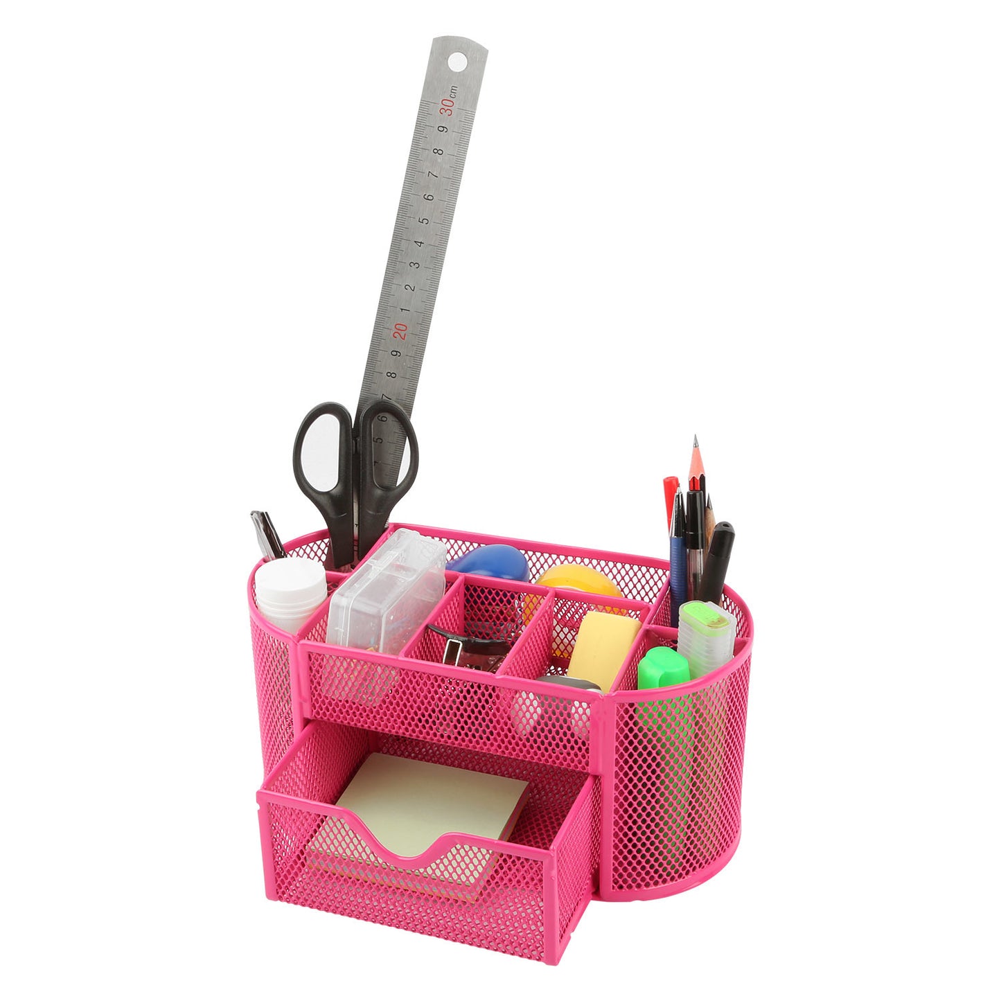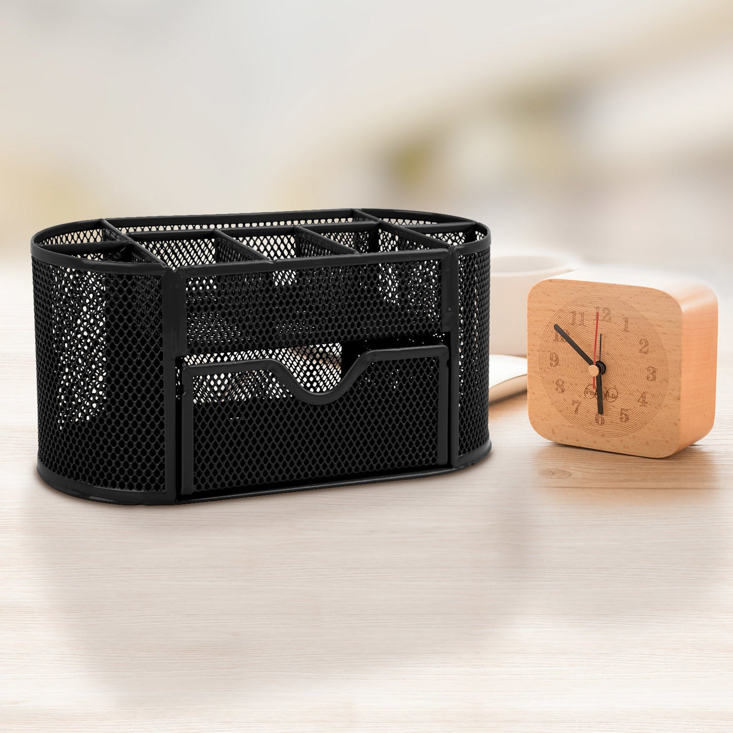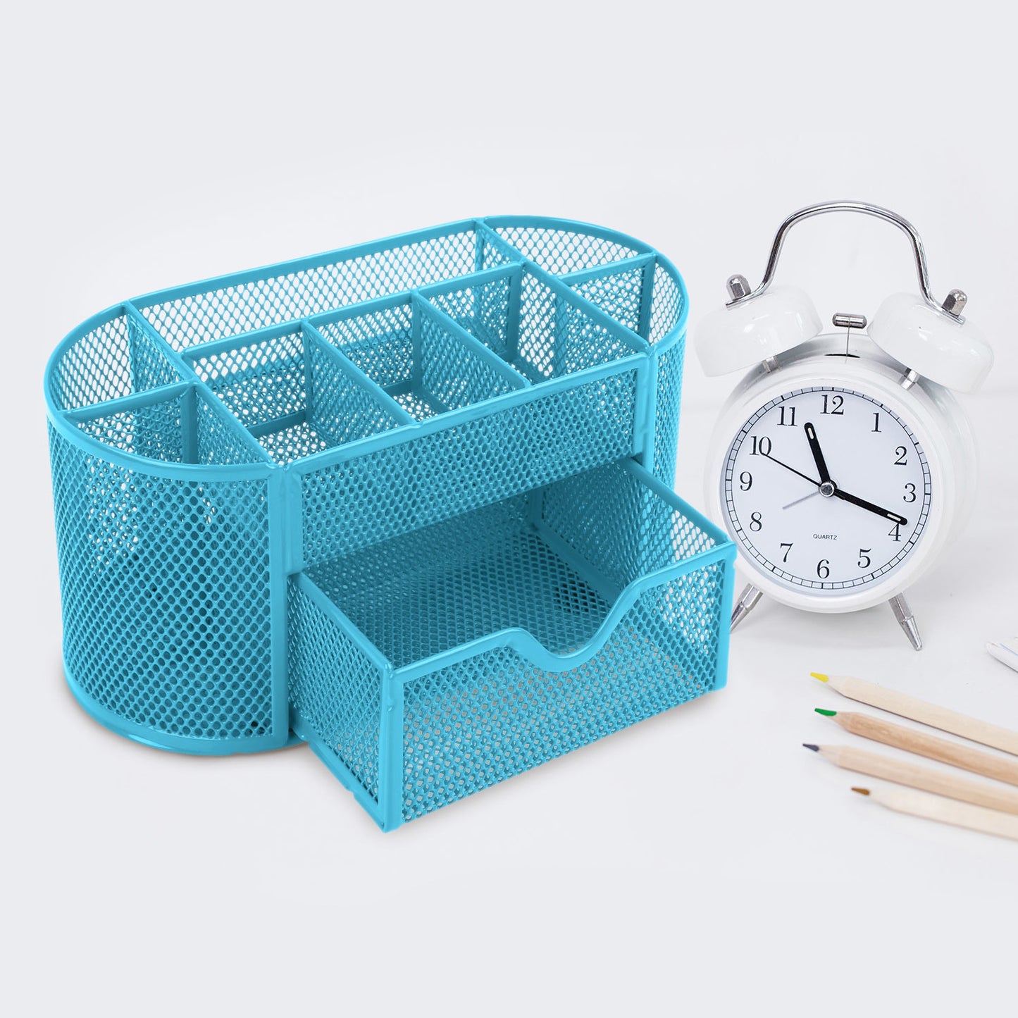 Comes with 8 parts and 1 slide drawer, 4 mesh hollow arc pencil side cups keep pens, rulers and scissors well organized, 4 additional shallow compartments on top