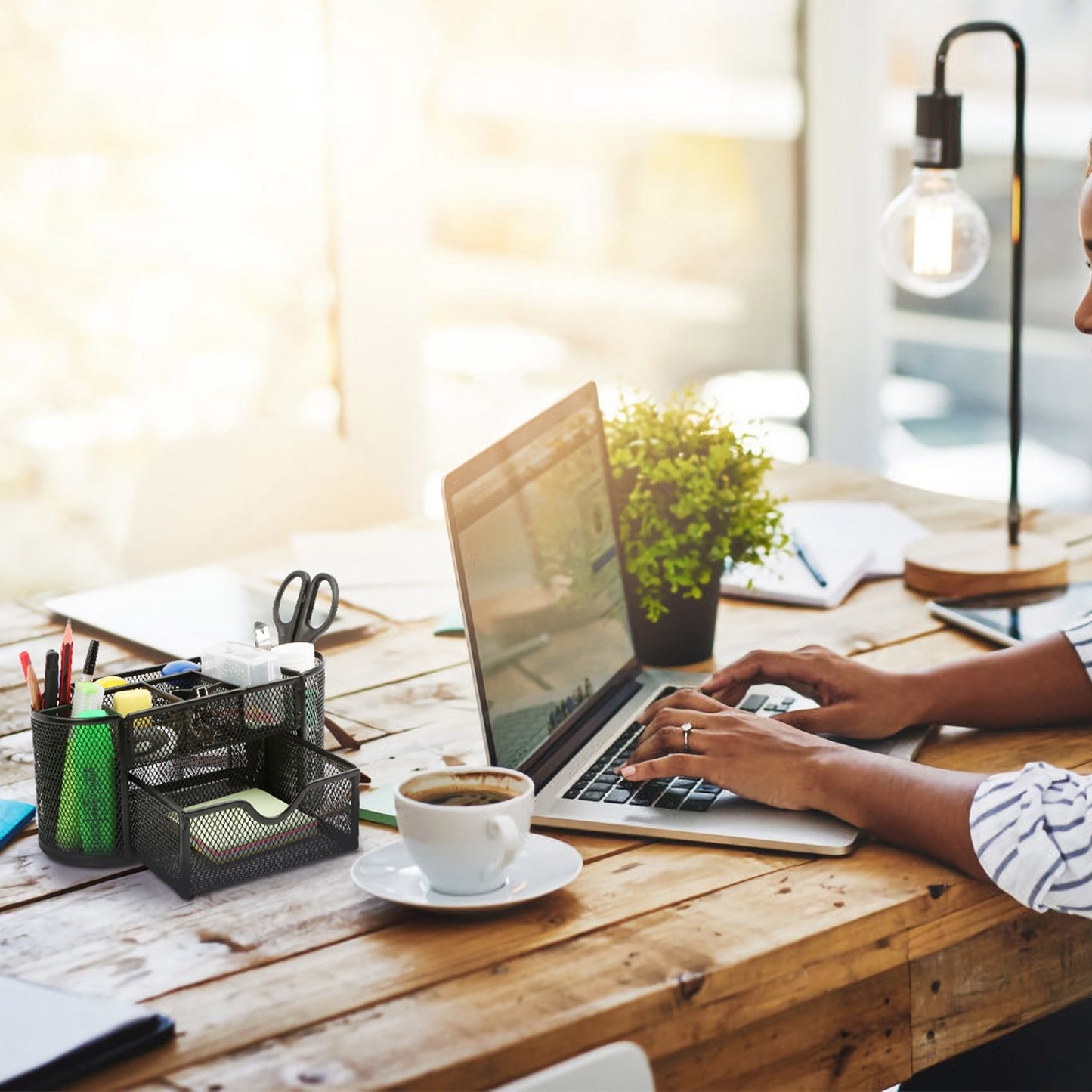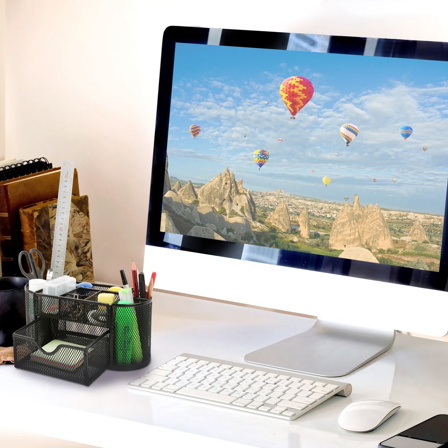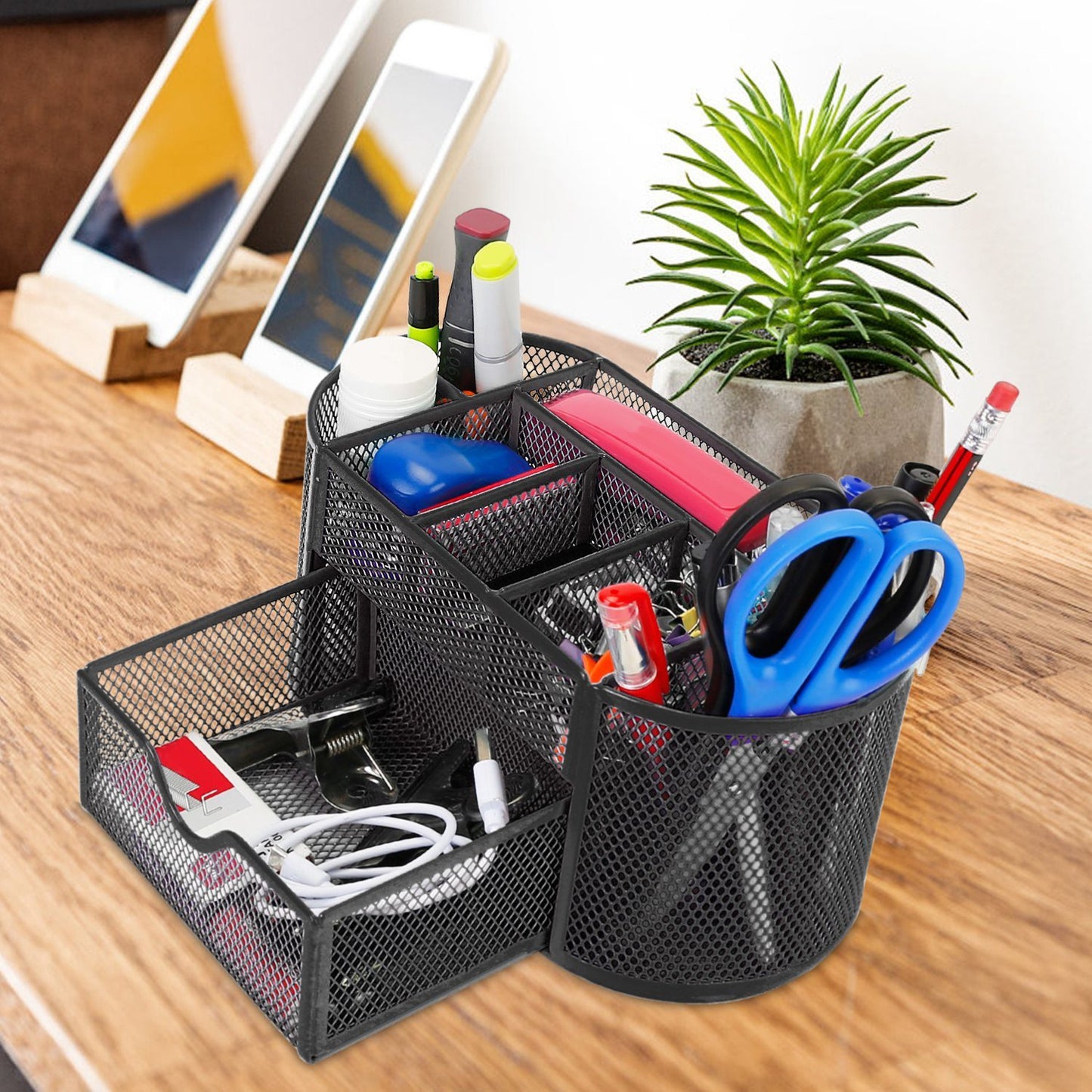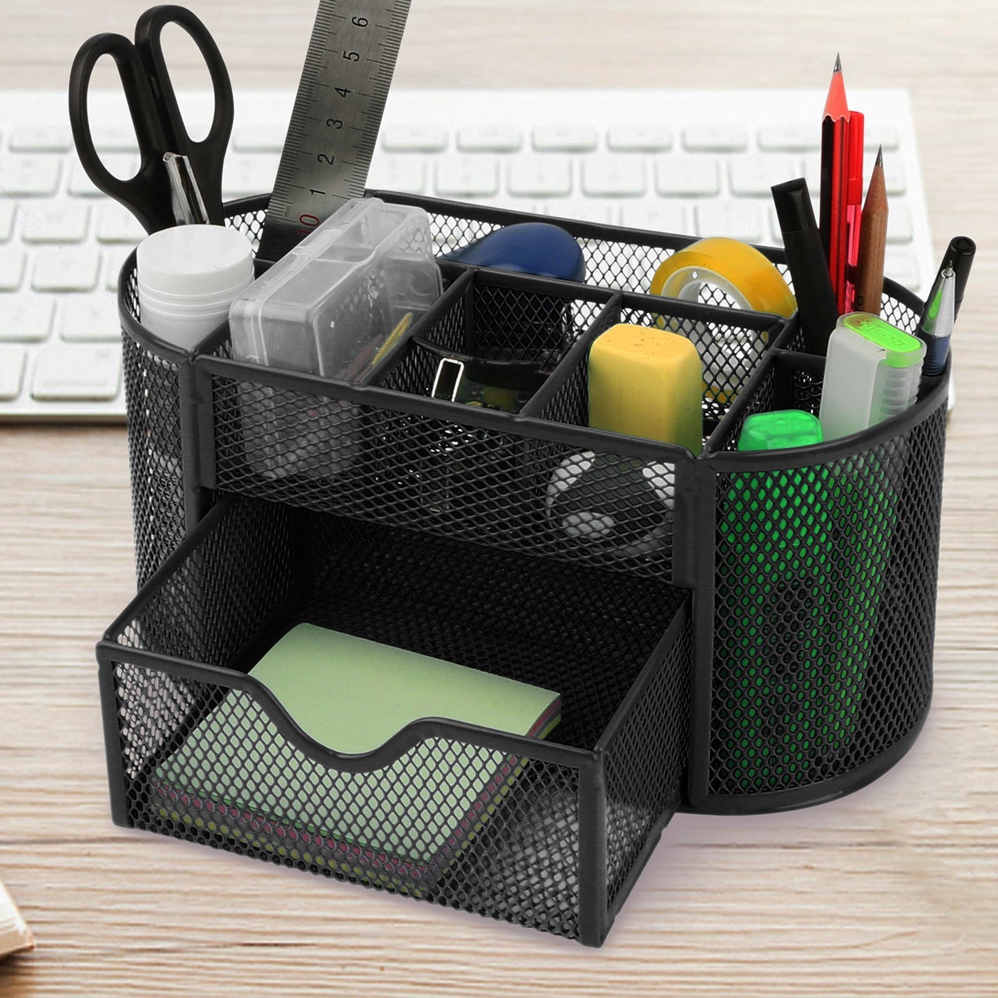 ** 9 COMPARTMENTS*:Comes with 8 parts and 1 slide drawer,4 mesh hollow arc pencil side cups keep pens,rulers and scissors well organized,4 additional shallow compartments on top for gadgets storage such as clips,thumbtacks and clamps,and 1 individual small notched supply drawer pulls out to hold 4.9'x4.6' sticky notes. A great organizer for keeping your desktop neat and tidy.