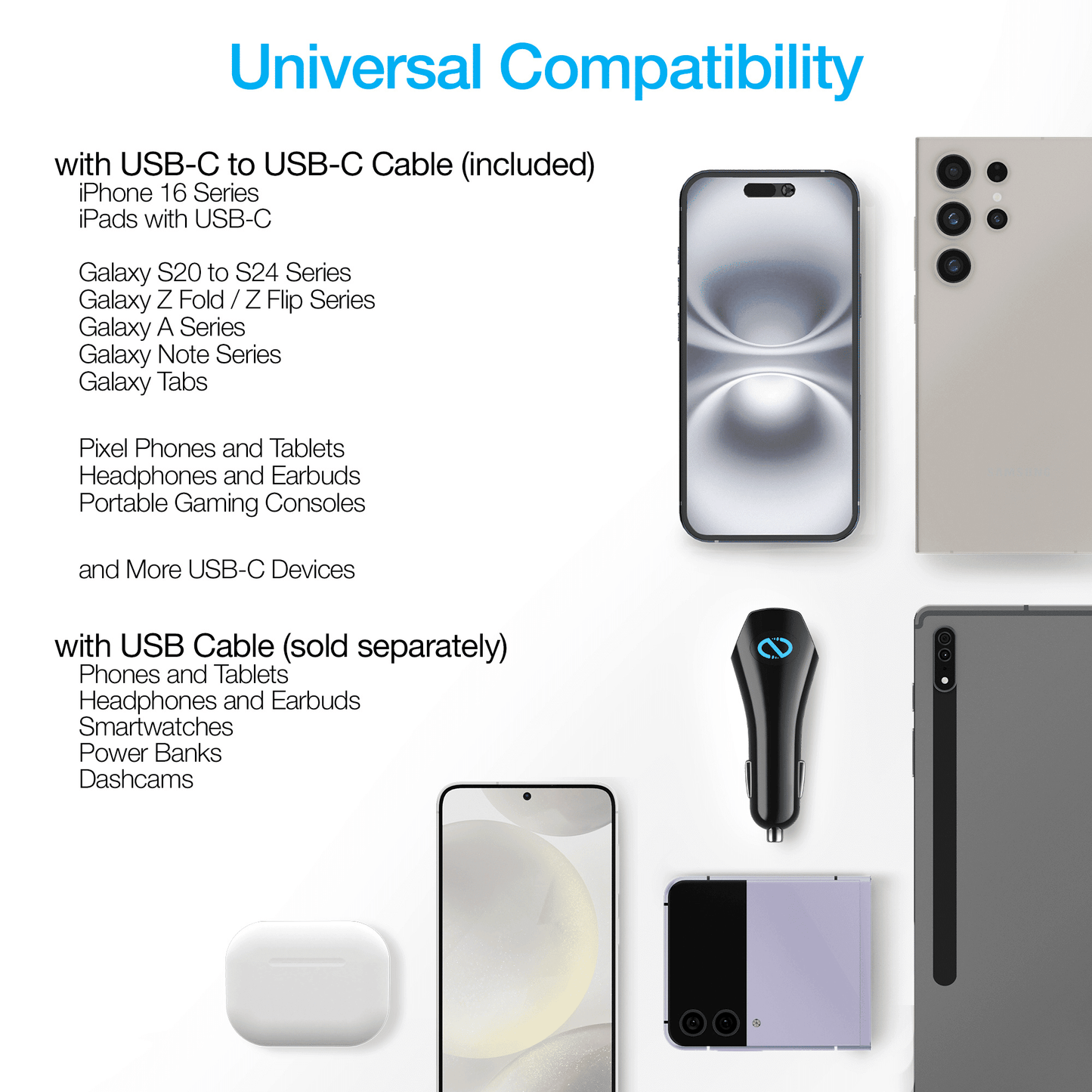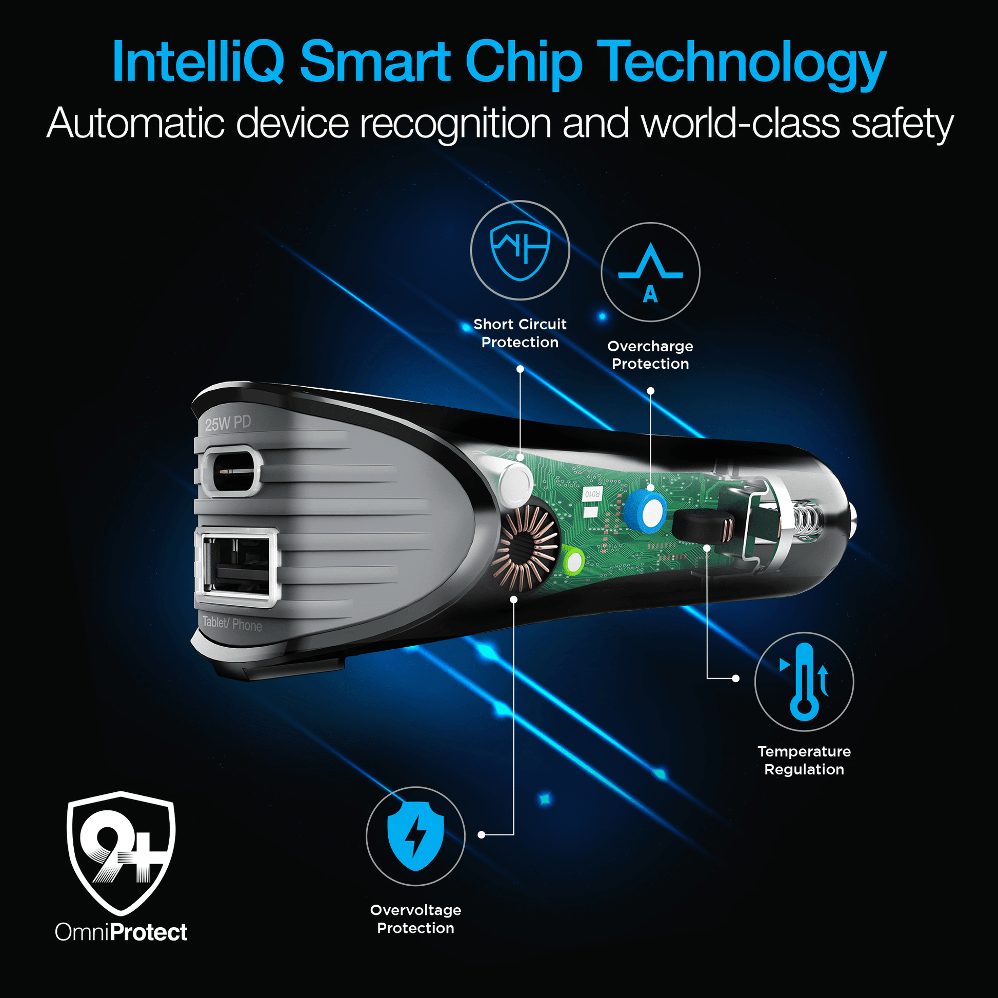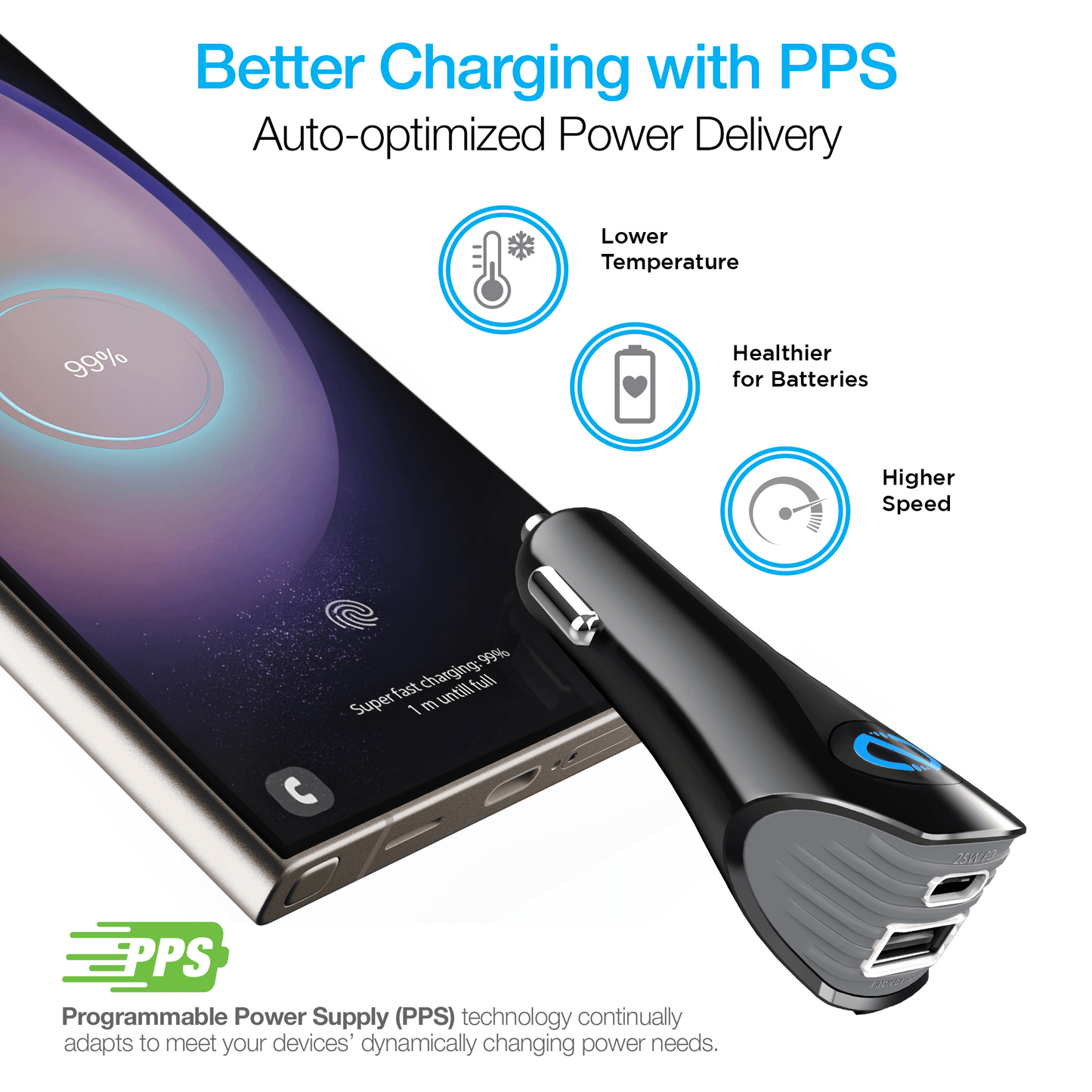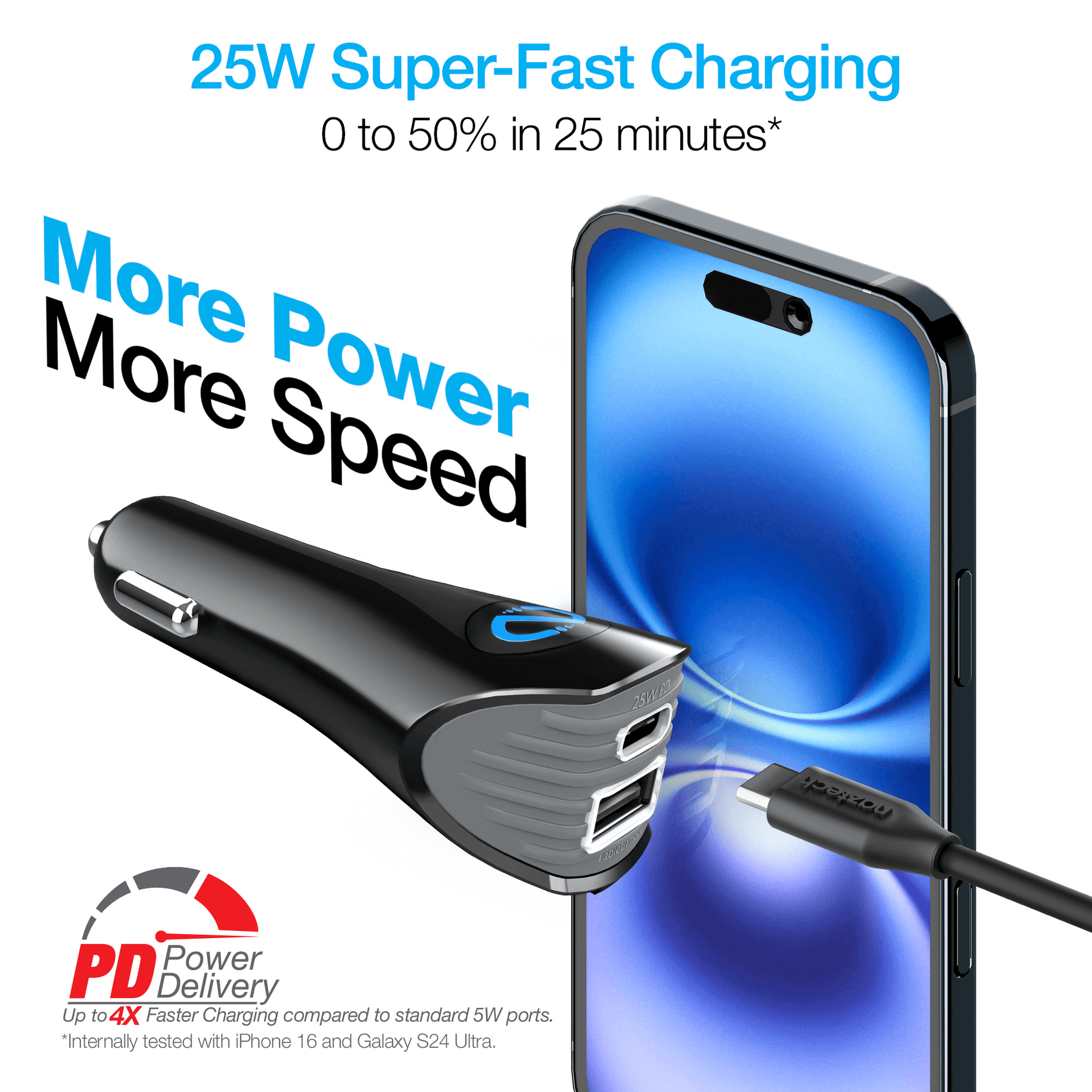 More Power. More Speed. Whether you’re powering up an iPhone 15 or a Samsung Galaxy, the SpeedMax25 dual-port car charger delivers ultra-fast charging, reaching 50% in just 25 minutes. The 25W USB-C Power Delivery port offers 5X more power than standard built-in USB ports, while the integrated PPS technology actively optimizes every charge to safeguard your battery from harmful heat. The extra 12W high-speed USB port operates on a separate circuit, ensuring fast charging for your phone while you charge another device at the same time.