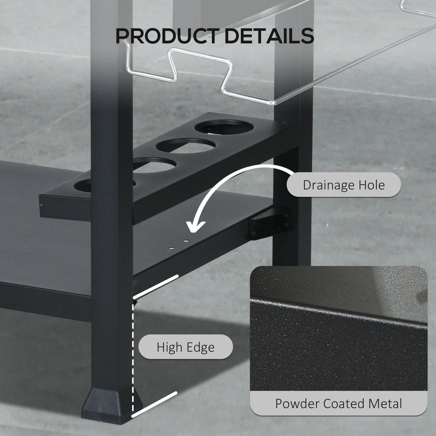 All-Inclusive Grill Station: This outdoor prep table bbq cart has everything you need to make meals mobile. Not only does it have a long extendable surface, but it also has 2 shelves, a gas tank holder, 4 wine bottle holders, a seasoning shelf, a paper towel rack, a garbage bag holder, and 6 hooks for hanging utensils.