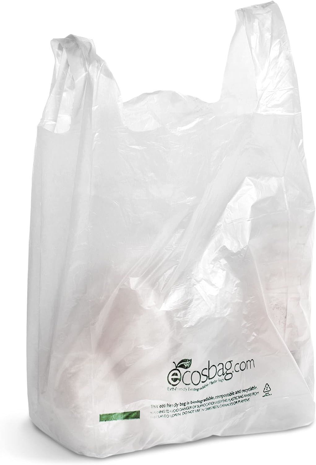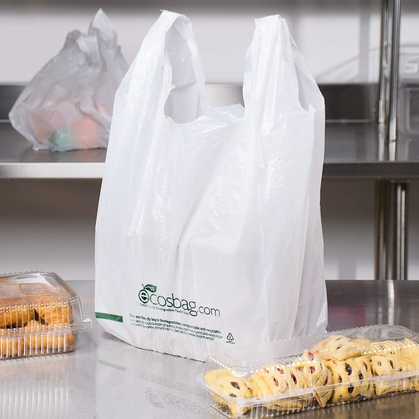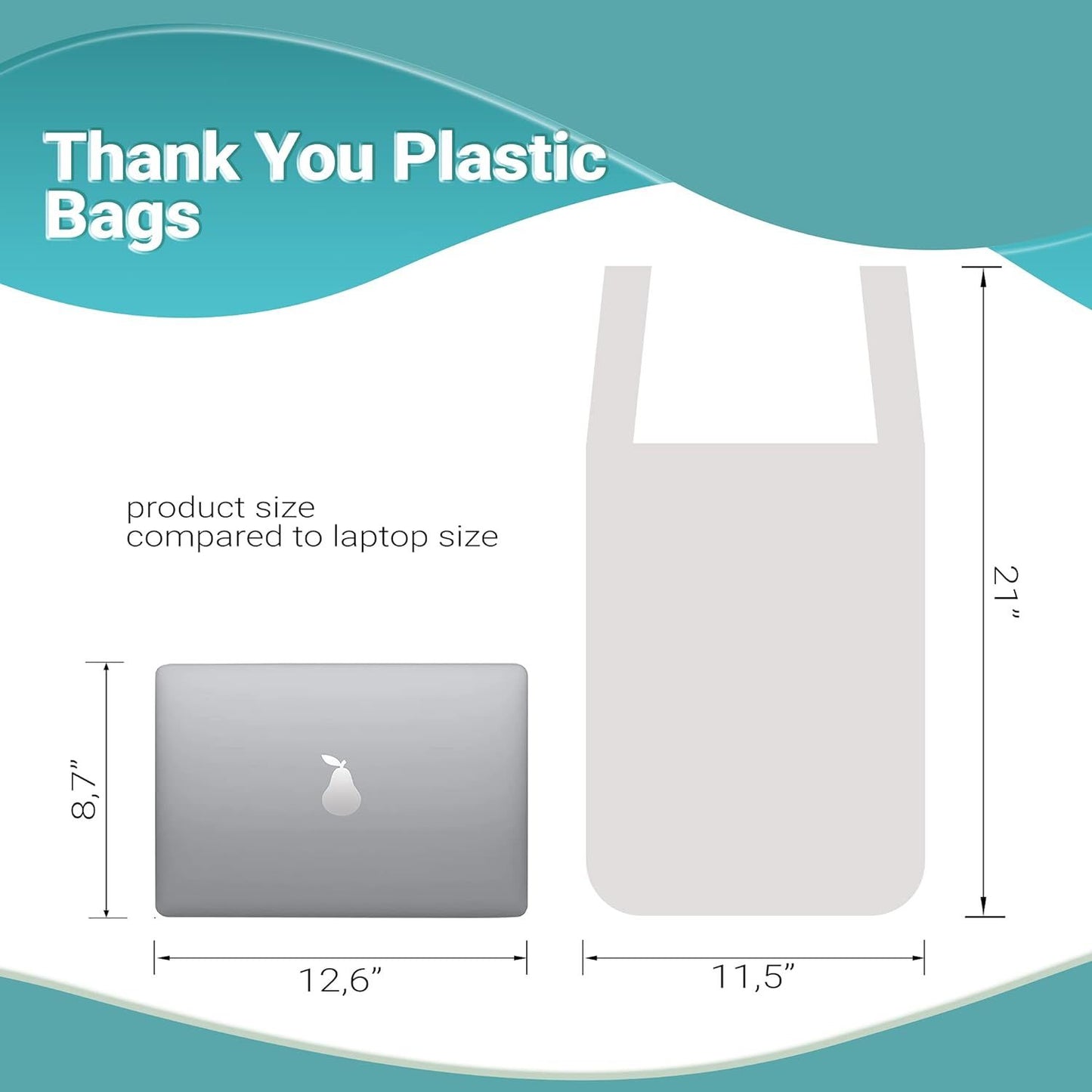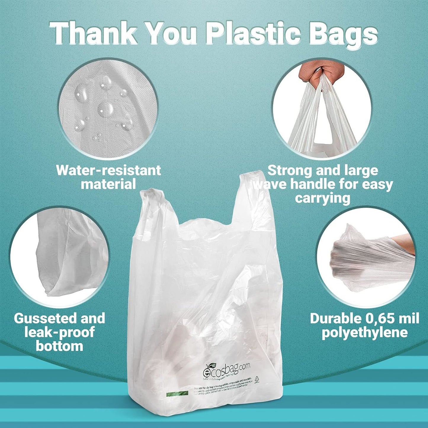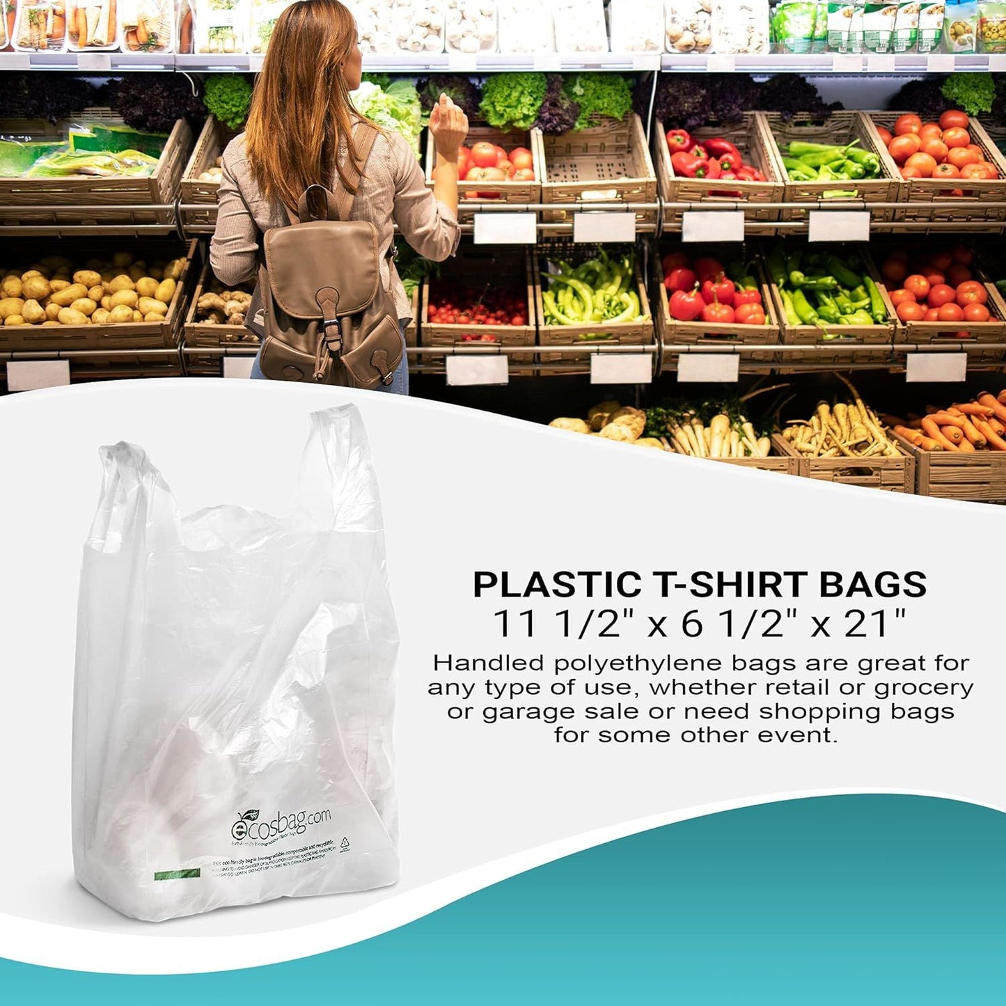 Pack of 1000 Earth Friendly Grocery Bags; White 11.5 x 6.5 x 21. Carry-Out T-Shirt Bags 11 1/2 x 6 1/2 x 21. Preprinted Shopping Poly Bags; 0.65 mil. Handle Plastic Bags for Store or Restaurant.