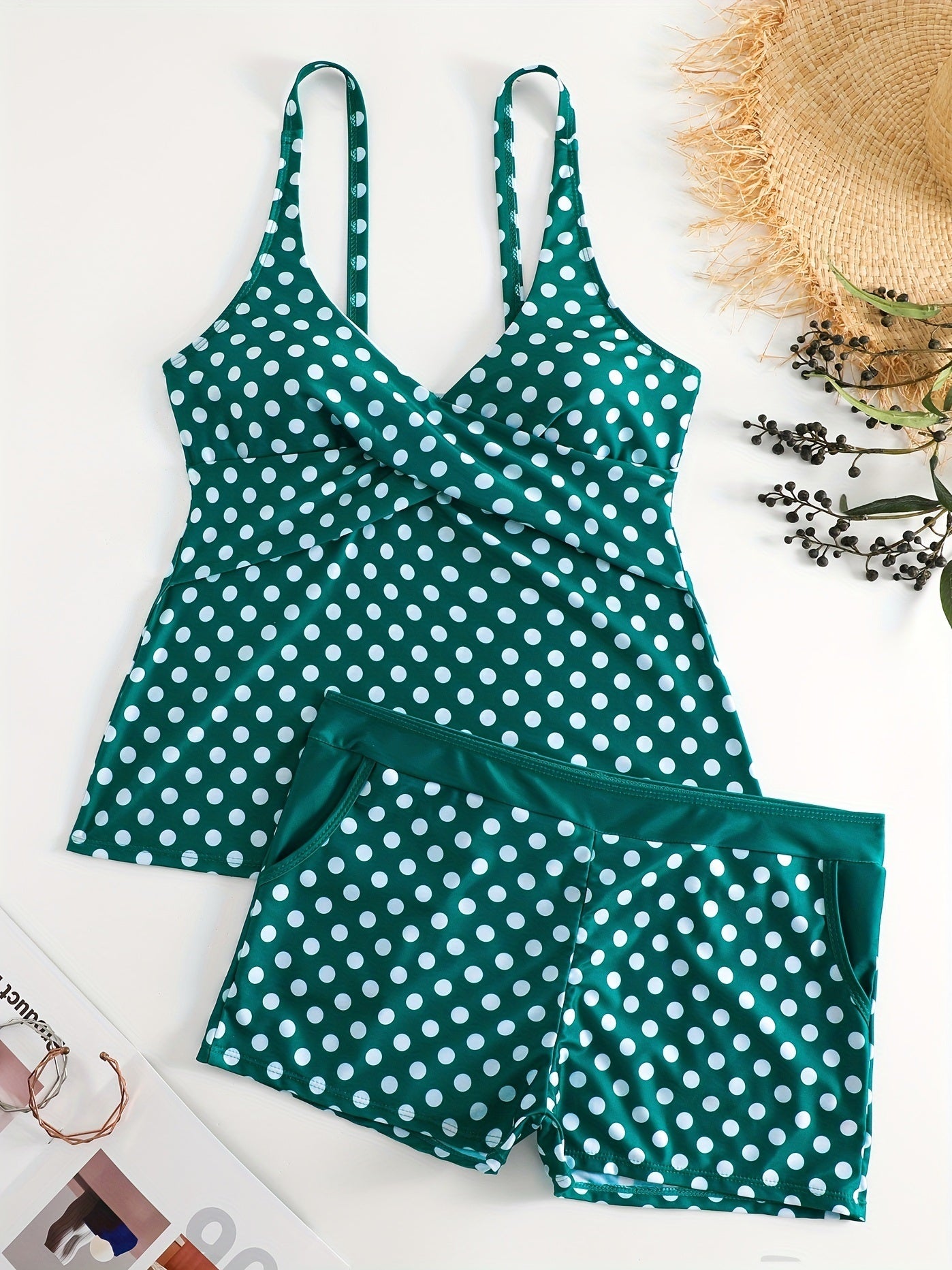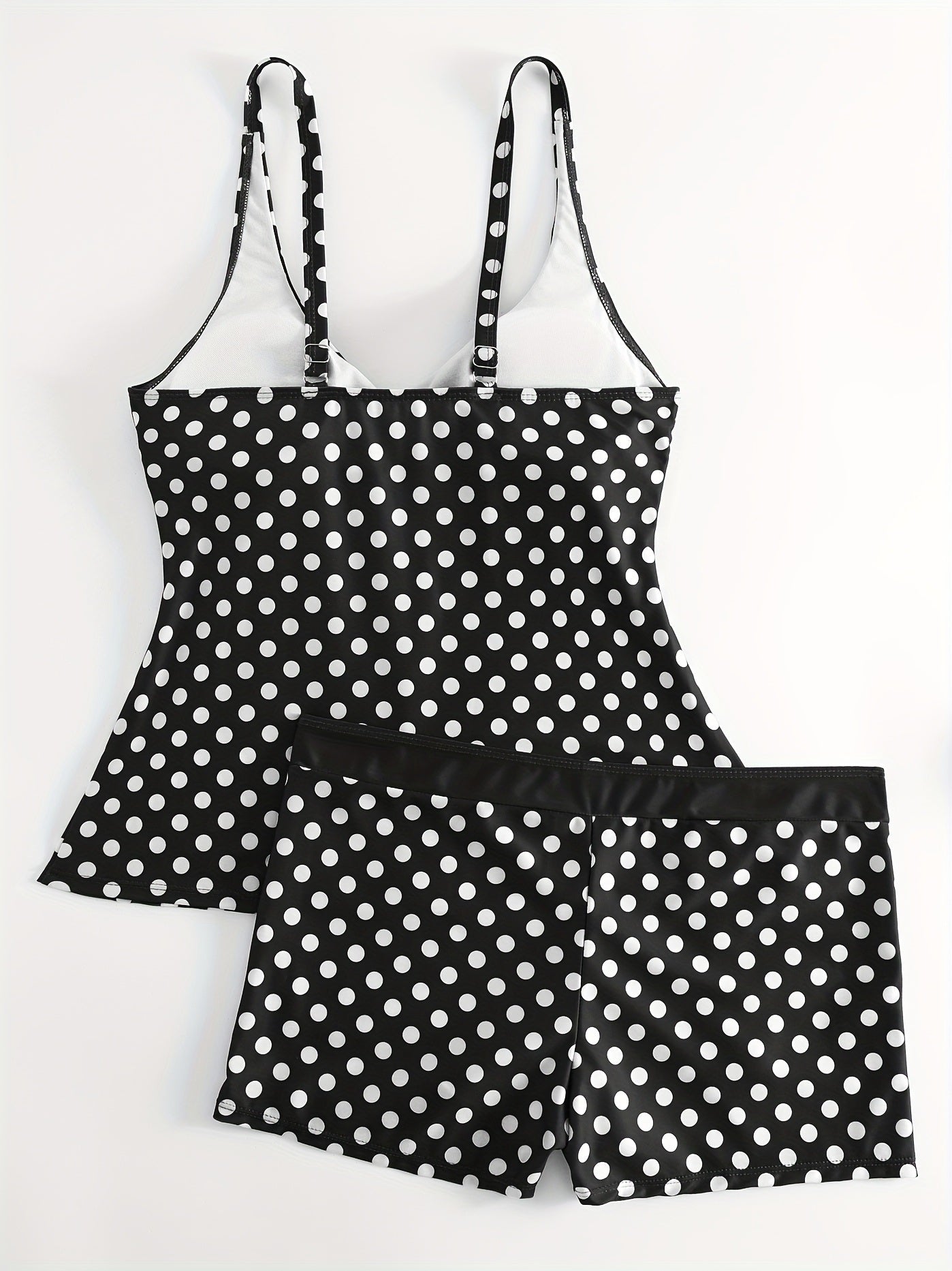 Solid Color Polka Dot Two Pieces Swimsuit, V Neck Mid-Stretch Boxer Short Bottom Bathing Suit, Women's Swimwear & Clothing