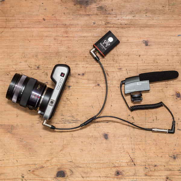 Custom-built Y-adapter-cable to hook up any Tentacle Sync Box to cameras with a 3.5mm microphone mini jack input while using an additional external microphone. Audio Timecode is recorded on the left channel and the external microphone on the right channel.