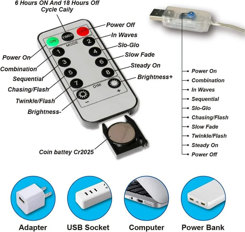 Modes: 8 lighting effects (steady, twinkle, fade, waves, sequence, slow glow, chasing, combination)