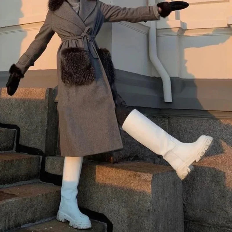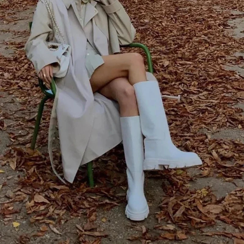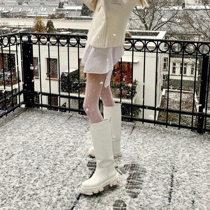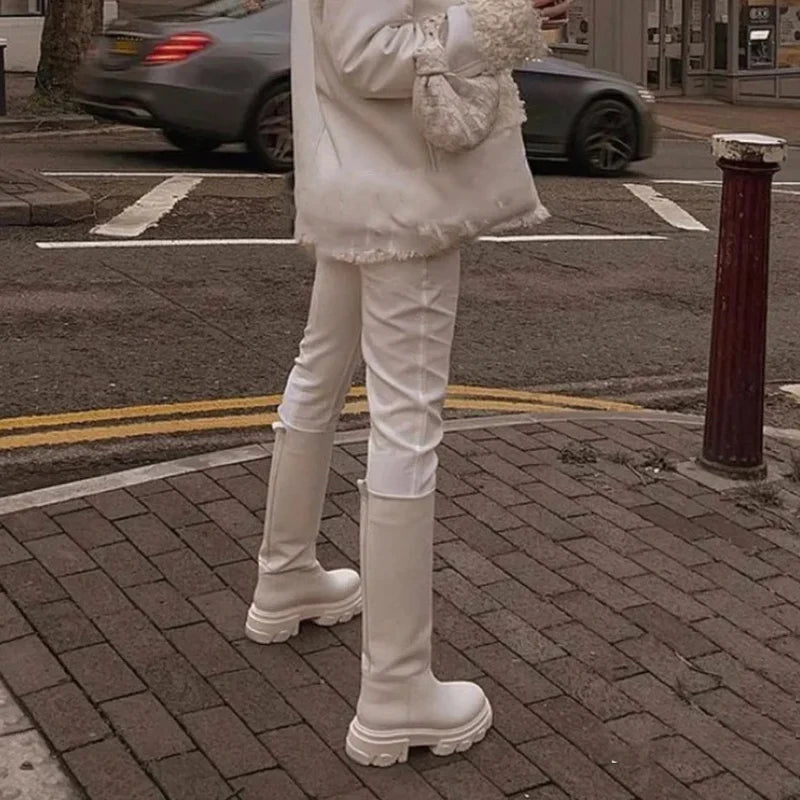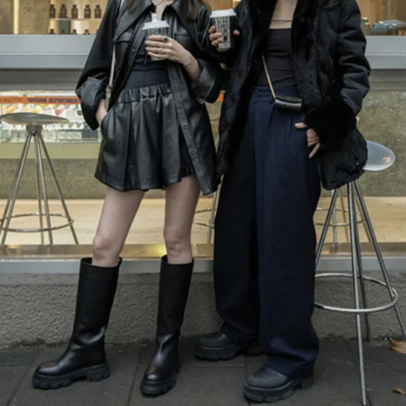 Women’s Cowhide Platform Riding Boots – Punk Leather Knee-Highs with Square Heels for Heavy Winter Impact